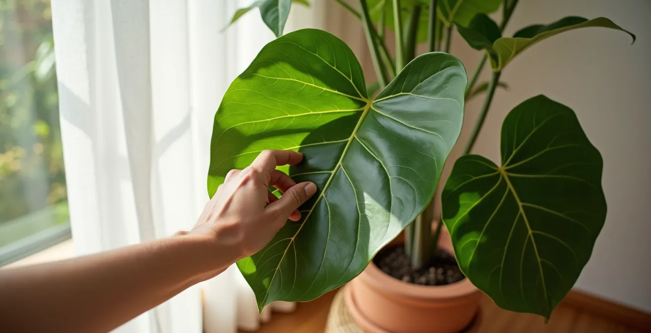 The correct approach is not to add a synthetic shine but to restore the leaf’s natural luster through gentle cleaning. A simple wipe-down with a soft, damp cloth every one to two weeks is all that is needed. For added pest prevention, you can use a DIY solution of a few drops of neem oil and a mild castile soap mixed in water. When cleaning, always support the underside of the leaf with one hand while gently wiping the top surface with the other to prevent tearing, especially on delicate new growth.
